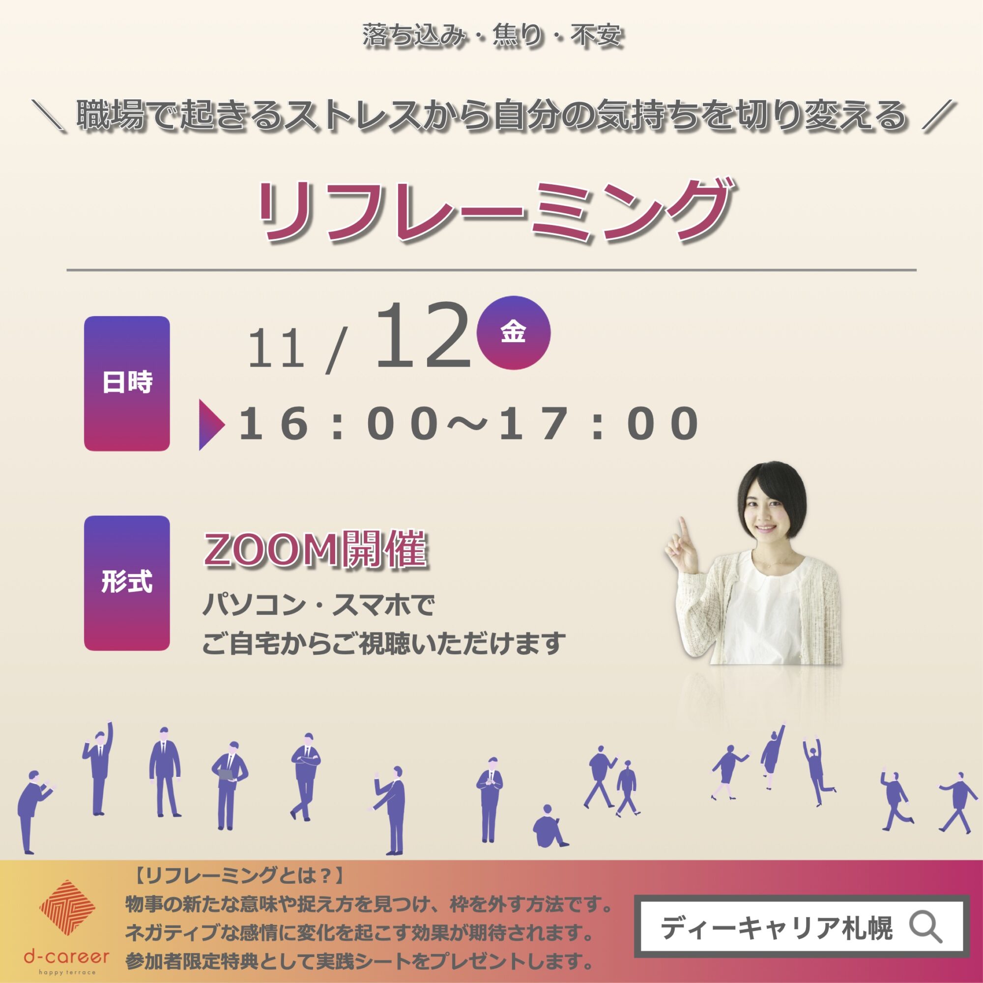 【ディーキャリア札幌オフィス】11月12日(金)「【ZOOM】職場で起きるストレスから自分の気持ちを切り変える:リフレーミング」