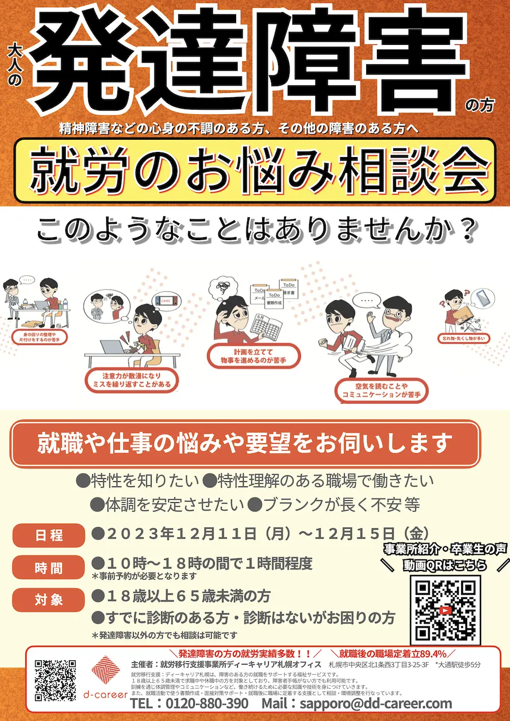【ディーキャリア札幌オフィス】12月11日(月)・12日(火)・13日(水)・14日(木)・15日(金)「発達障害の方・障害のある方のための就労相談会」