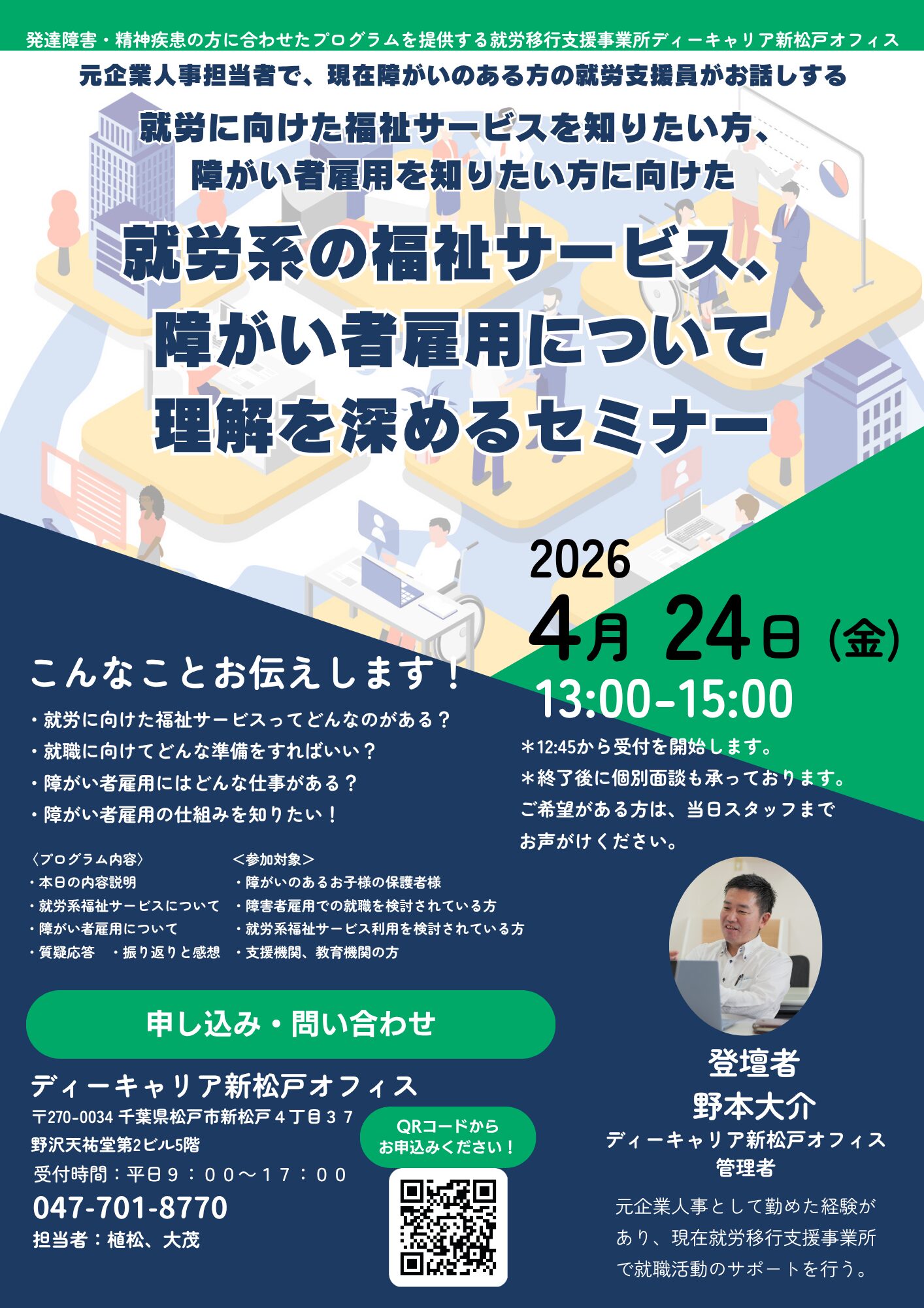 【ディーキャリア新松戸オフィス】4月24日(金)「【就労系福祉サービス】&【障がい者雇用】について、理解を深めるセミナー」