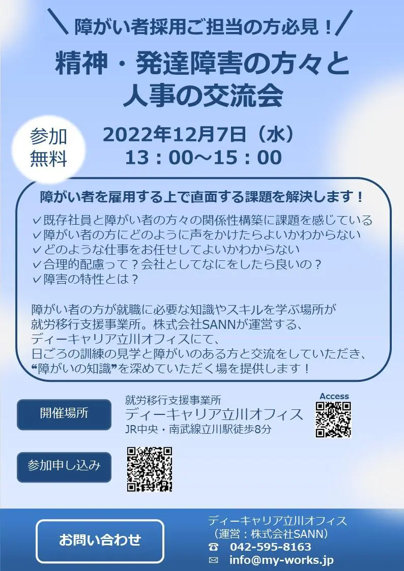 【ディーキャリア立川オフィス】12月07日(月)「障がい者採用ご担当の方必見!『精神・発達障害の方々と人事の交流会』」