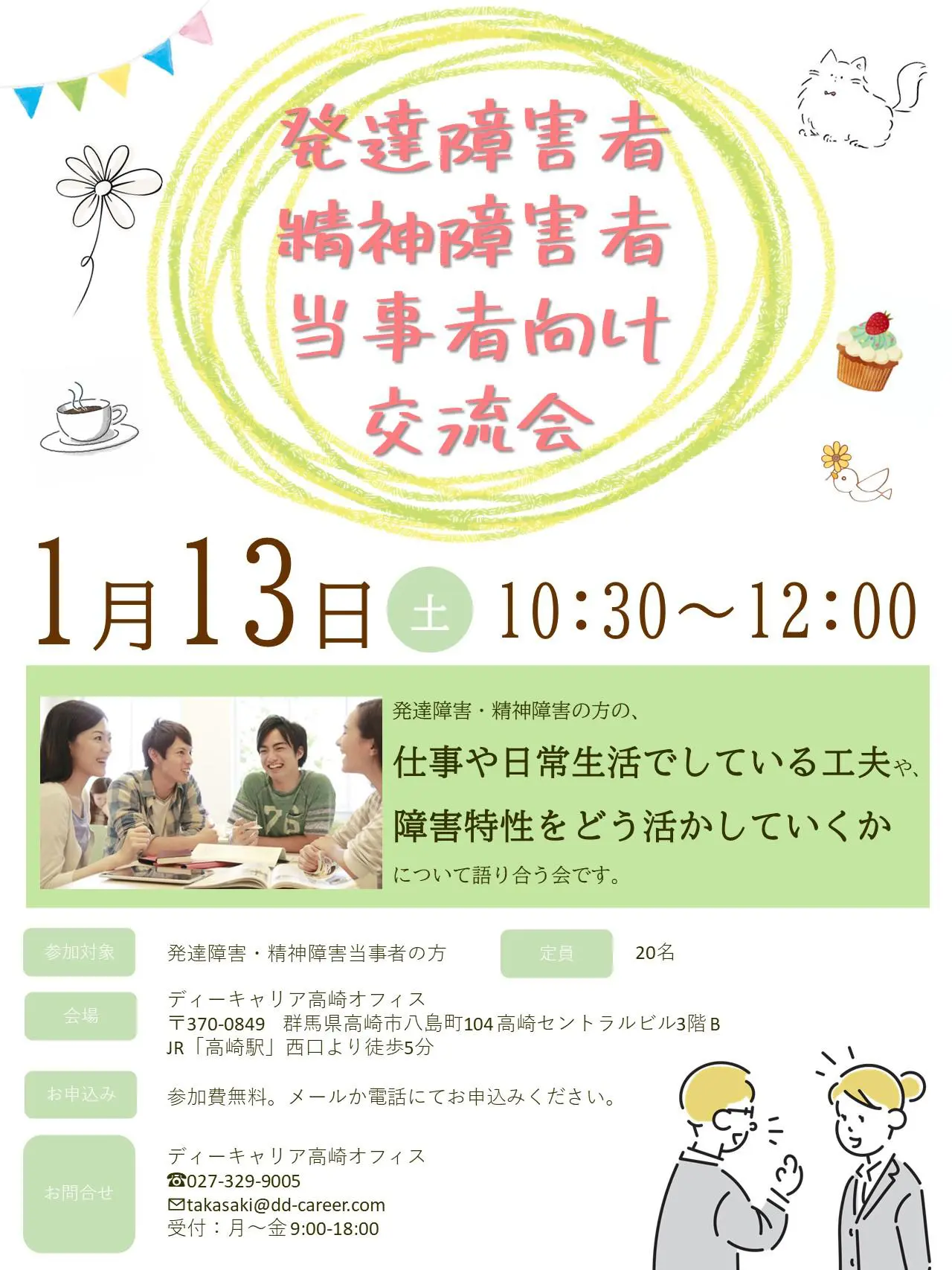 【ディーキャリア高崎第2オフィス】1月13日(土)開催「特性について語り合う~発達・精神障害者当事者向け交流会~」