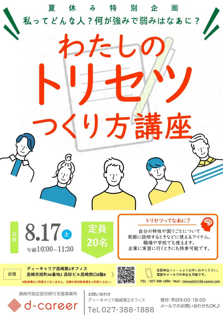 【ディーキャリア高崎第2オフィス】8月17日(土)「★夏休み特別企画★ 自分のトリセツをつくってみよう!!」