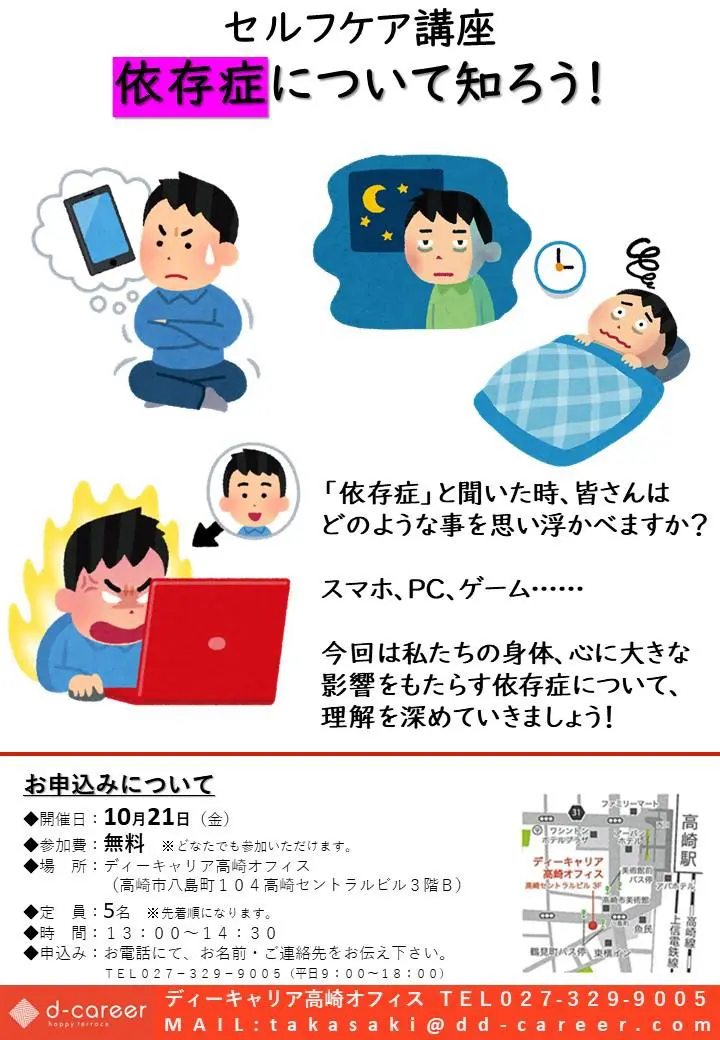 【ディーキャリア高崎オフィス】10月21日(金)「セルフケア講座 依存症について知ろう!」