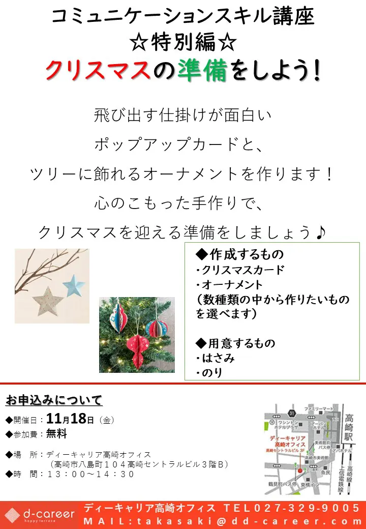 【ディーキャリア高崎オフィス】11月18日(金)「コミュニケーションスキル講座特別編 クリスマスの準備をしよう!」
