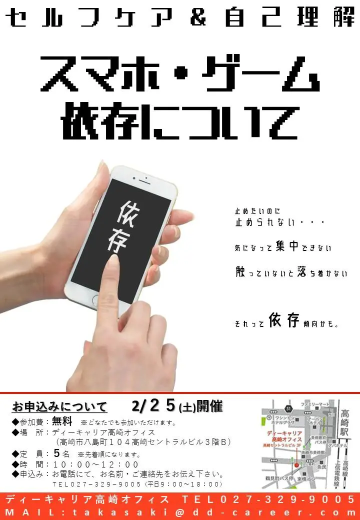 【ディーキャリア高崎オフィス】2月25日(土)「セルフケア&自己理解 ~スマホ・ゲーム依存について~」