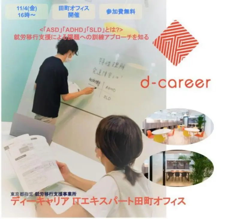 【ディーキャリアITエキスパート田町オフィス】11月4日(金) 「<「ASD」「ADHD」「SLD」とは?>就労移行支援による特性の困りごとへの訓練アプローチを知る」