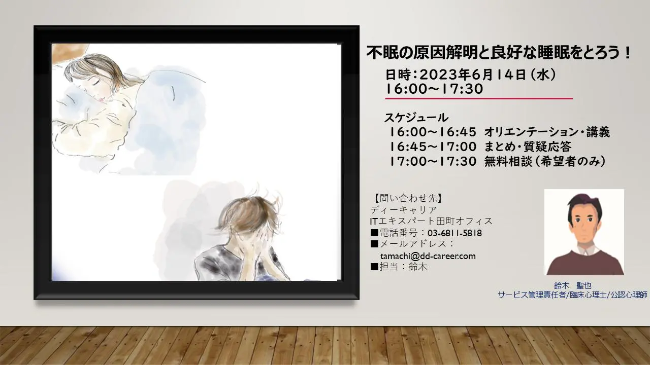 【ディーキャリアITエキスパート田町オフィス】6月14日(水)「不眠の原因解明をし、良好な睡眠をとろう!」