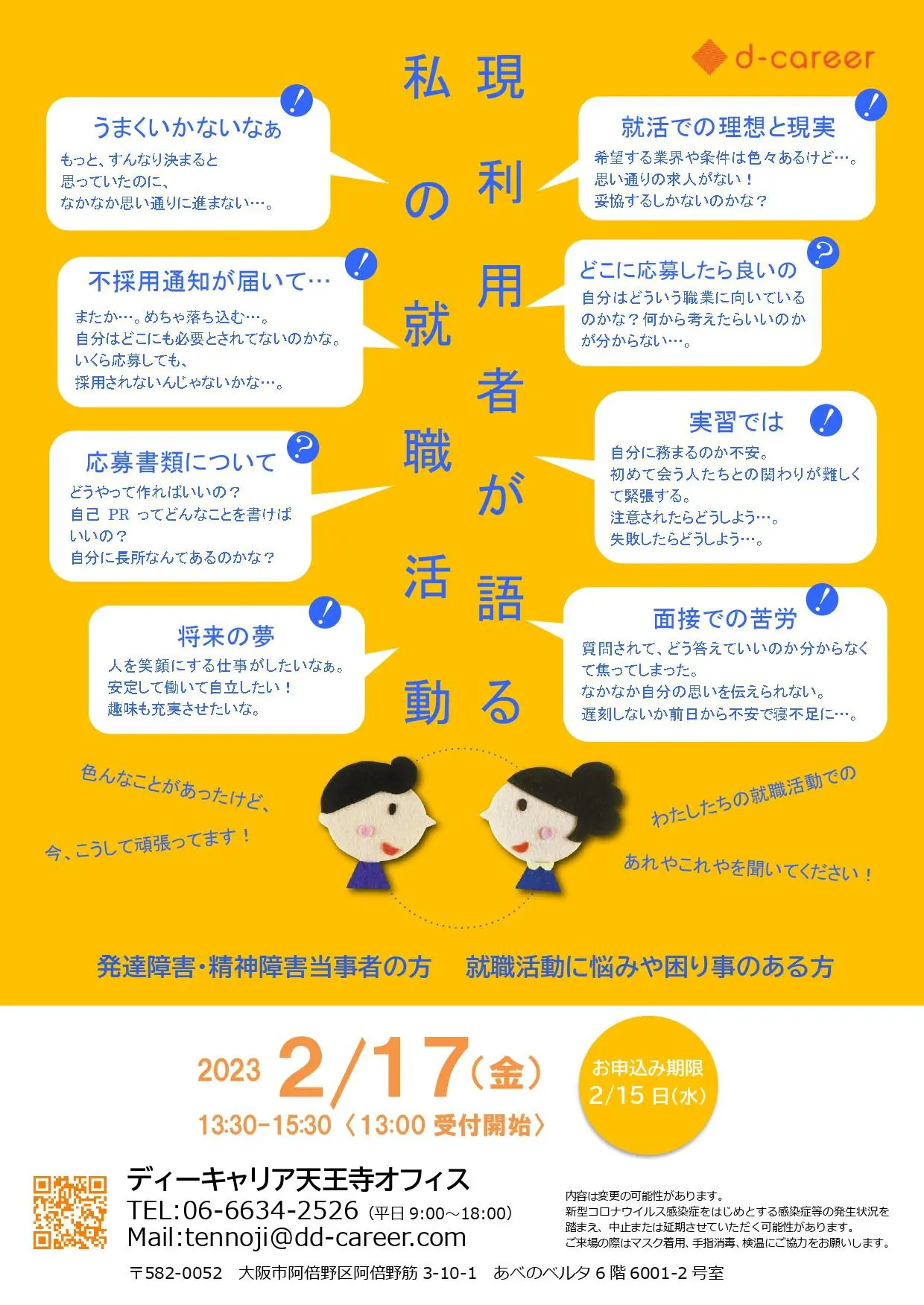 【ディーキャリア天王寺オフィス】2月17日(金)「現利用者が語る 私の就職活動」