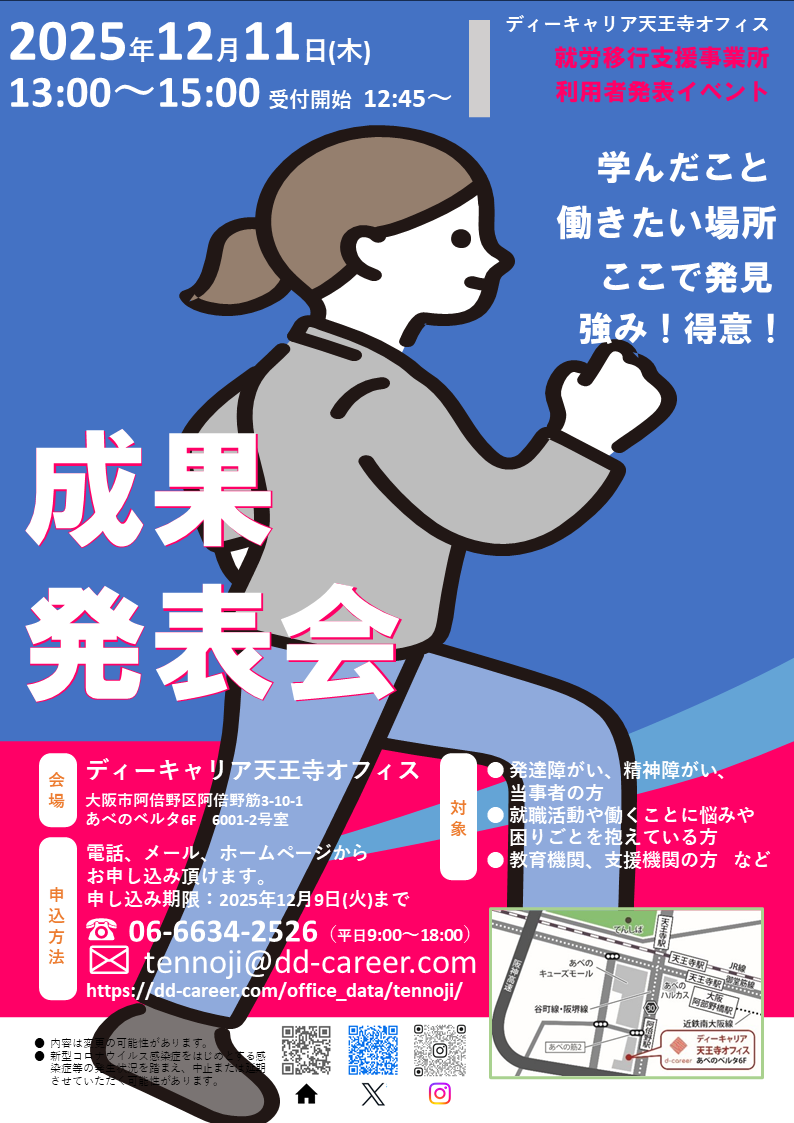 【ディーキャリア天王寺オフィス】12月11日(木)「利用者発表イベント『成果発表〜ディーキャリア天王寺オフィスで私が成長した理由~』」