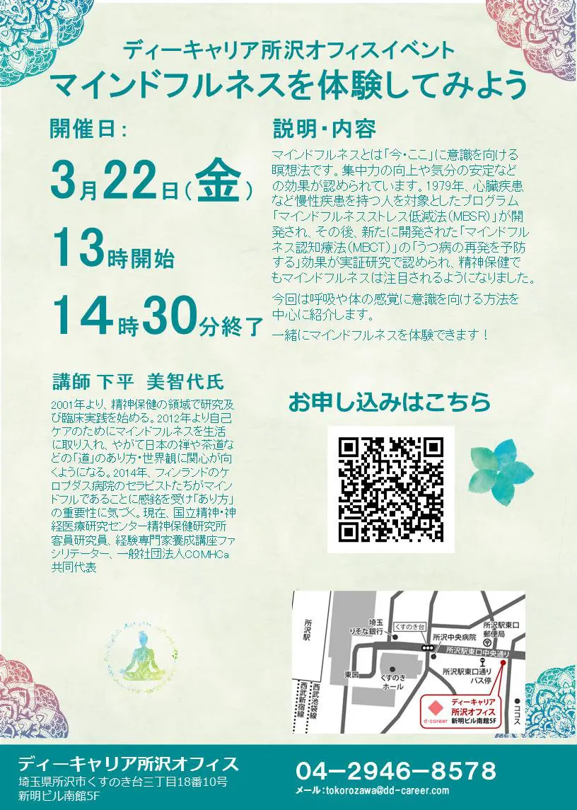 【ディーキャリア所沢オフィス】3月22日(金)「マインドフルネスを体験してみよう」
