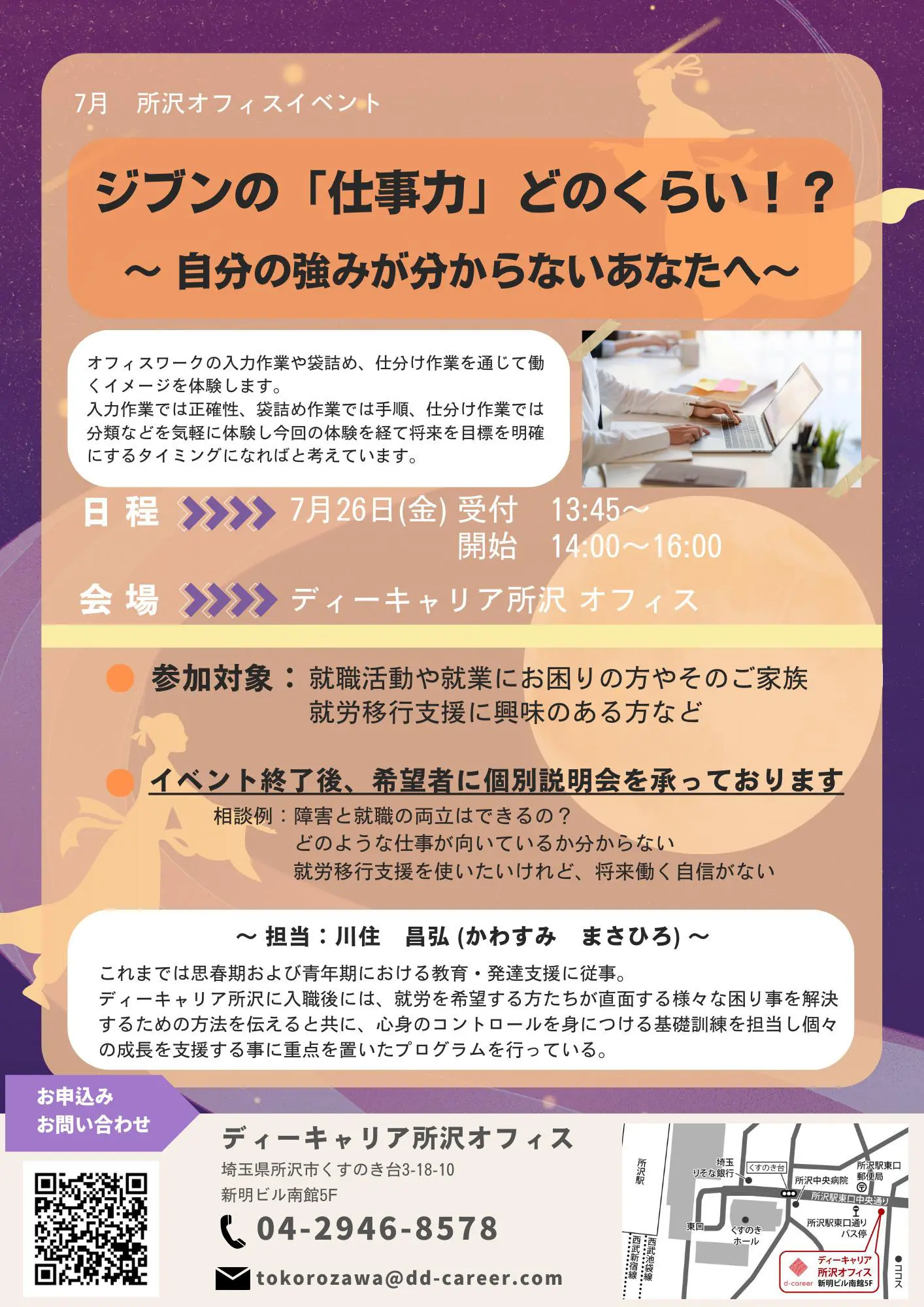 【ディーキャリア所沢オフィス】7月26日(金)「ジブンの「仕事力」どのくらい!? ~ 自分の強みが分からないあなたへ~」
