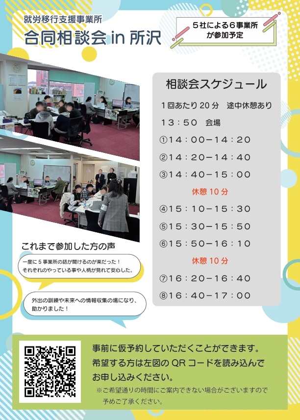 所沢市の5つの就労移行支援事業所が集まり、一度に各事業所の様子をみることが出来ます。