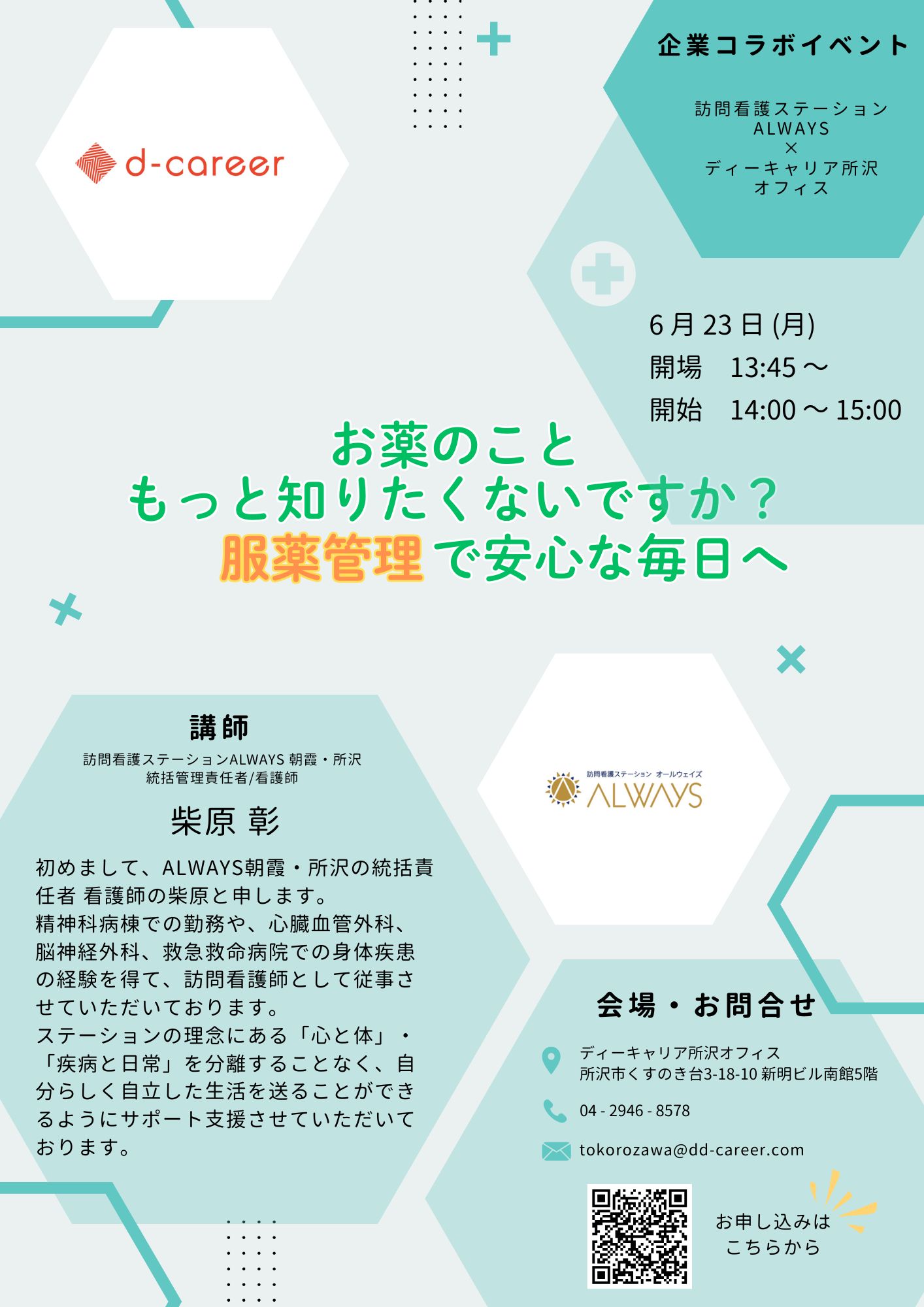 【ディーキャリア所沢オフィス】6月23日(月)「お薬のこともっと知りたくないですか?服薬管理で安心な毎日へ」