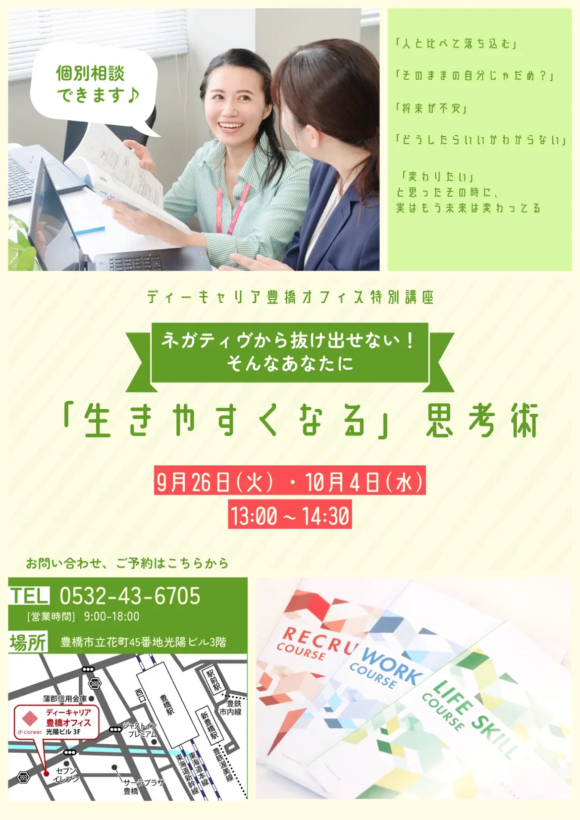 【ディーキャリア豊橋オフィス】09月26日(火)・10月04日(水)「ネガティブから抜け出せない!そんなあなたに「生きやすくなる」思考術」