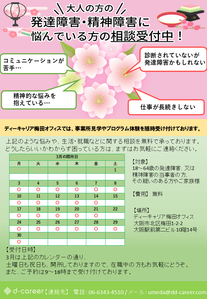 【ディーキャリア梅田オフィス】3月平日開催「3月の事業所見学・体験日のお知らせ」