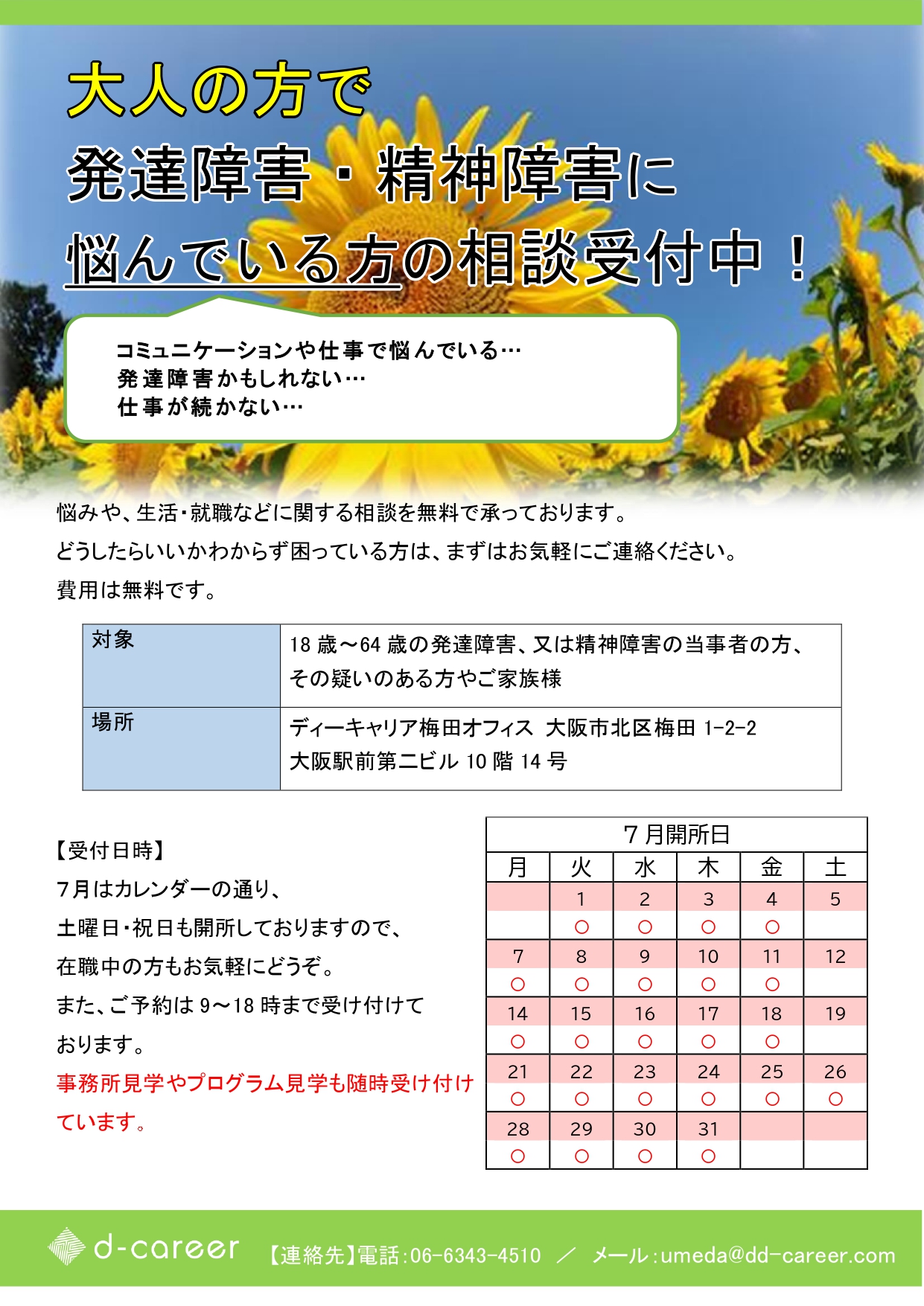 【ディーキャリア梅田オフィス】7月平日開催「7月の事業所見学・体験日のお知らせ」