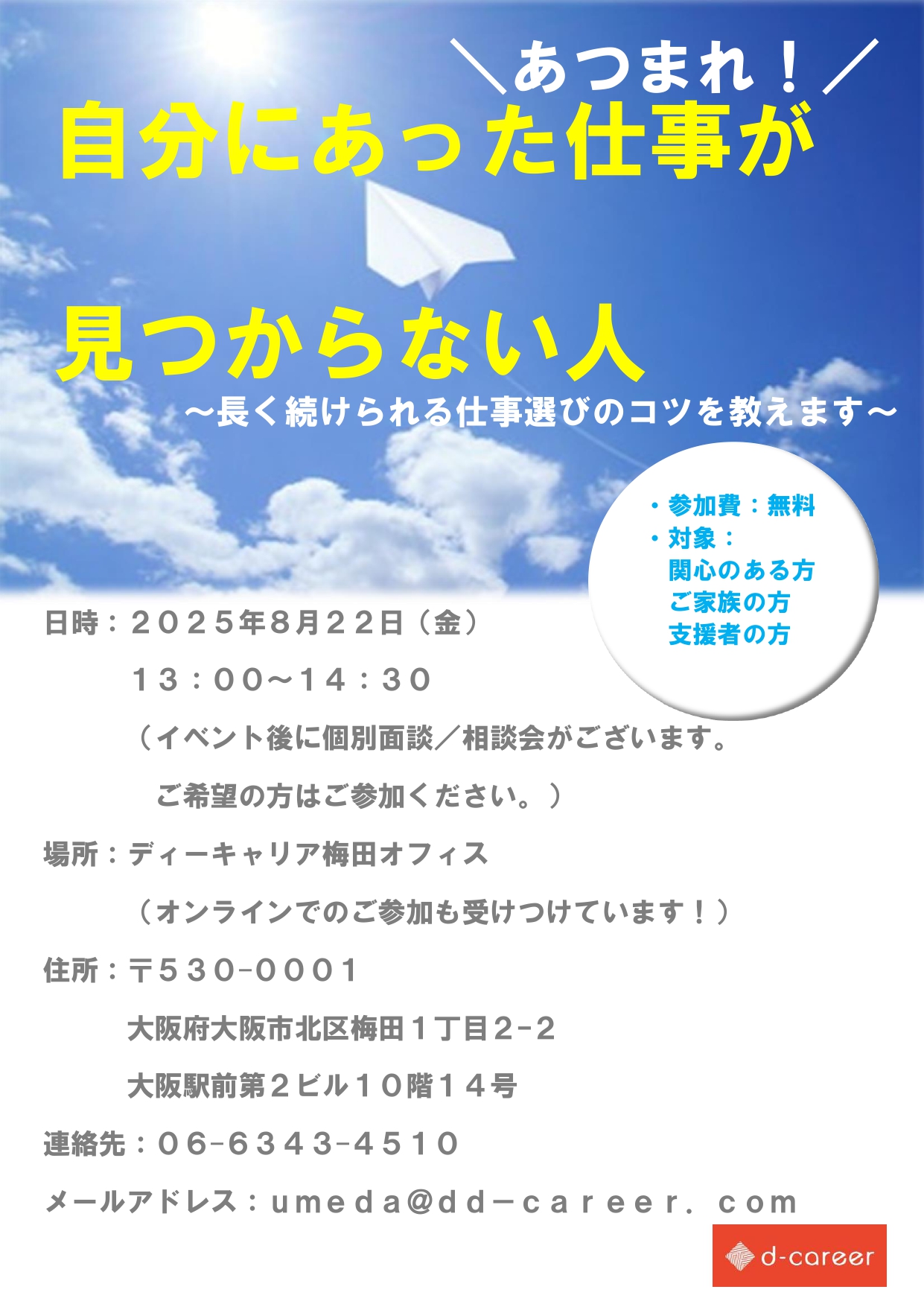 【ディーキャリア梅田オフィス】8月22日(金)「あつまれ!自分にあった仕事が見つからない人~長く続けられる仕事選びのコツを教えます~」
