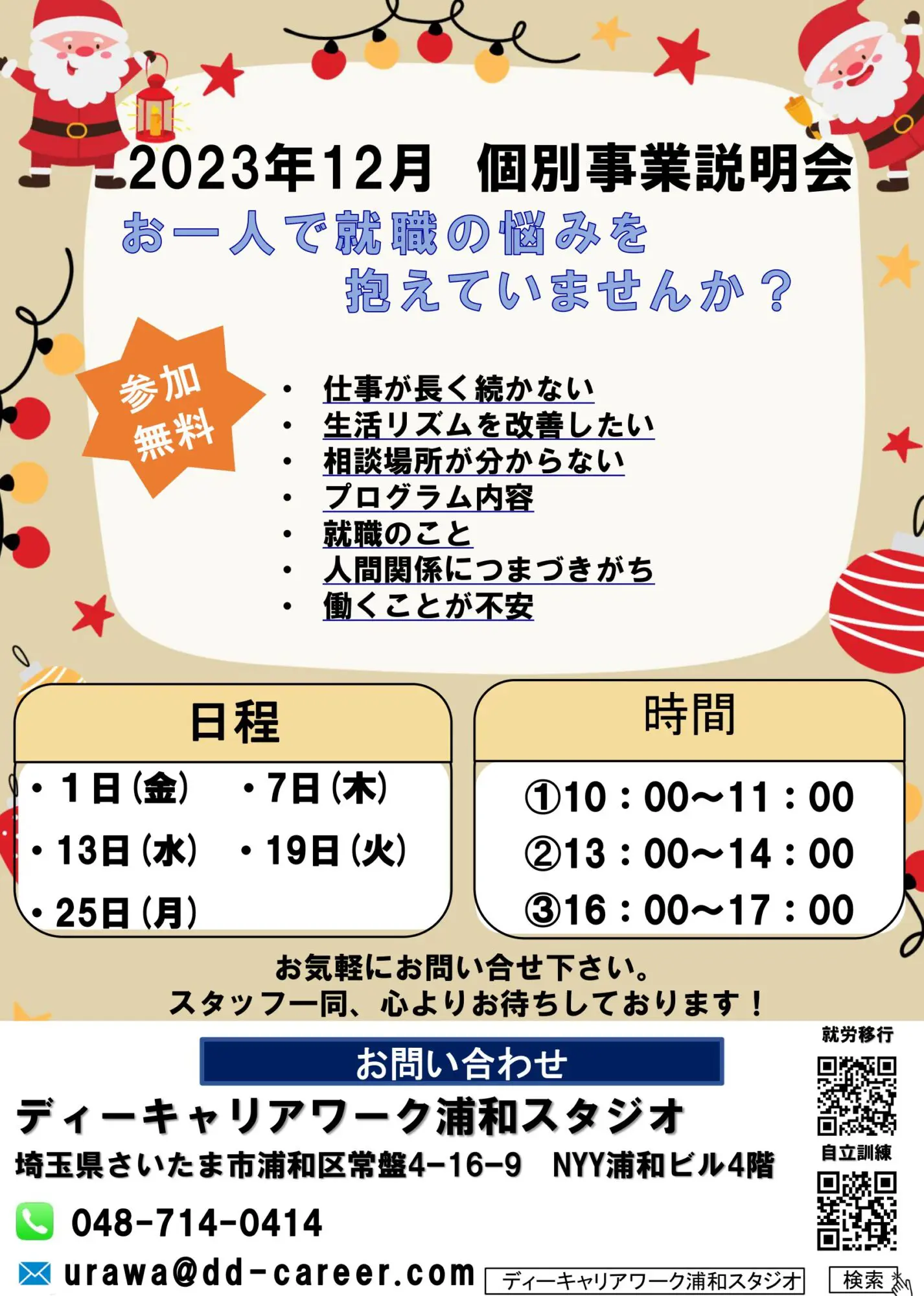 【ディーキャリアワーク浦和スタジオ】12月07日(木)・13日(水)・19日(火)・25日(月)開催「個別事業説明会」