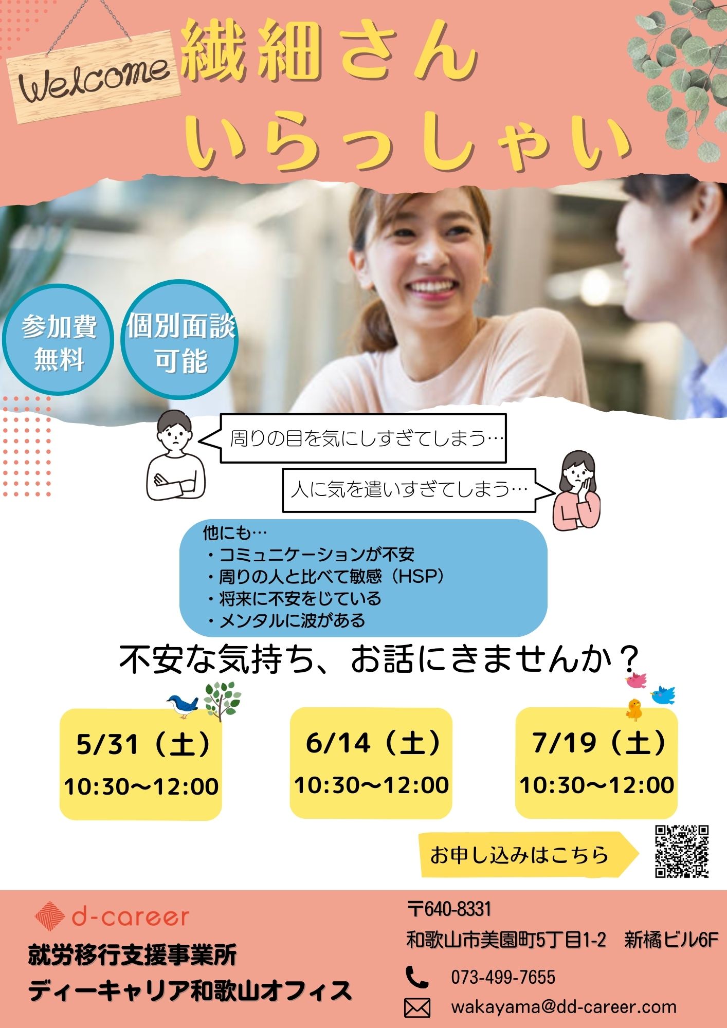【ディーキャリア和歌山オフィス】05月31日(土)・06月14日(土)・07月19日(土)「繊細さんいらっしゃい」