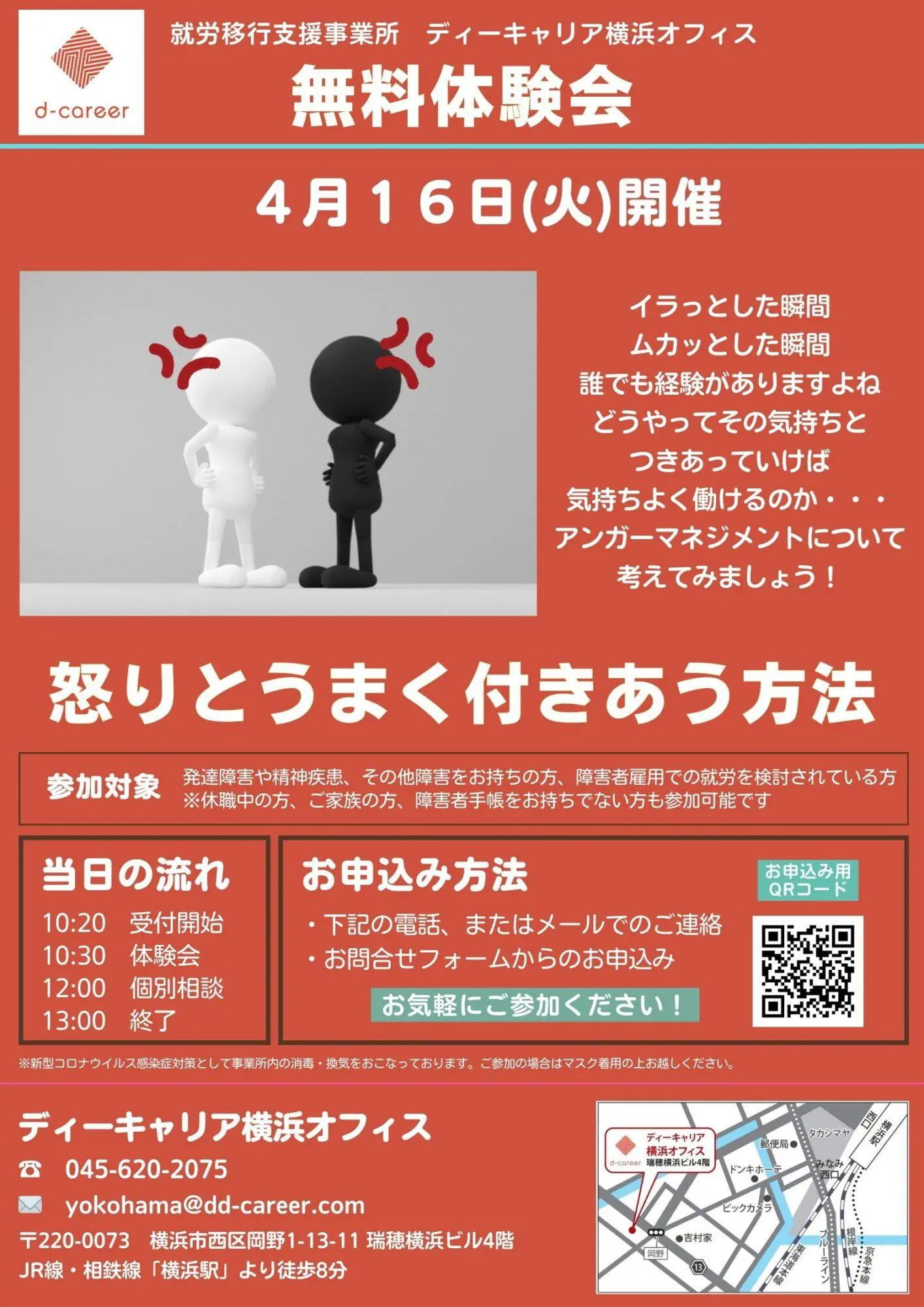 4月16日(火)ディーキャリア横浜 無料体験会「怒りとうまくつき合う方法」開催!