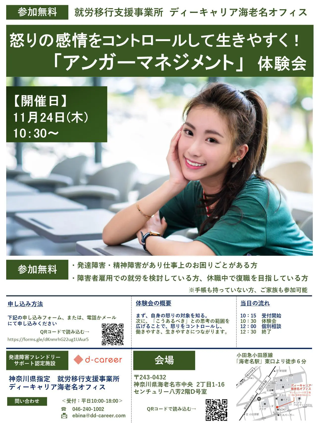 【ディーキャリア海老名オフィス】11月24日(木)「怒りの感情をコントロールして生きやすく!「アンガーマネジメント」体験会」
