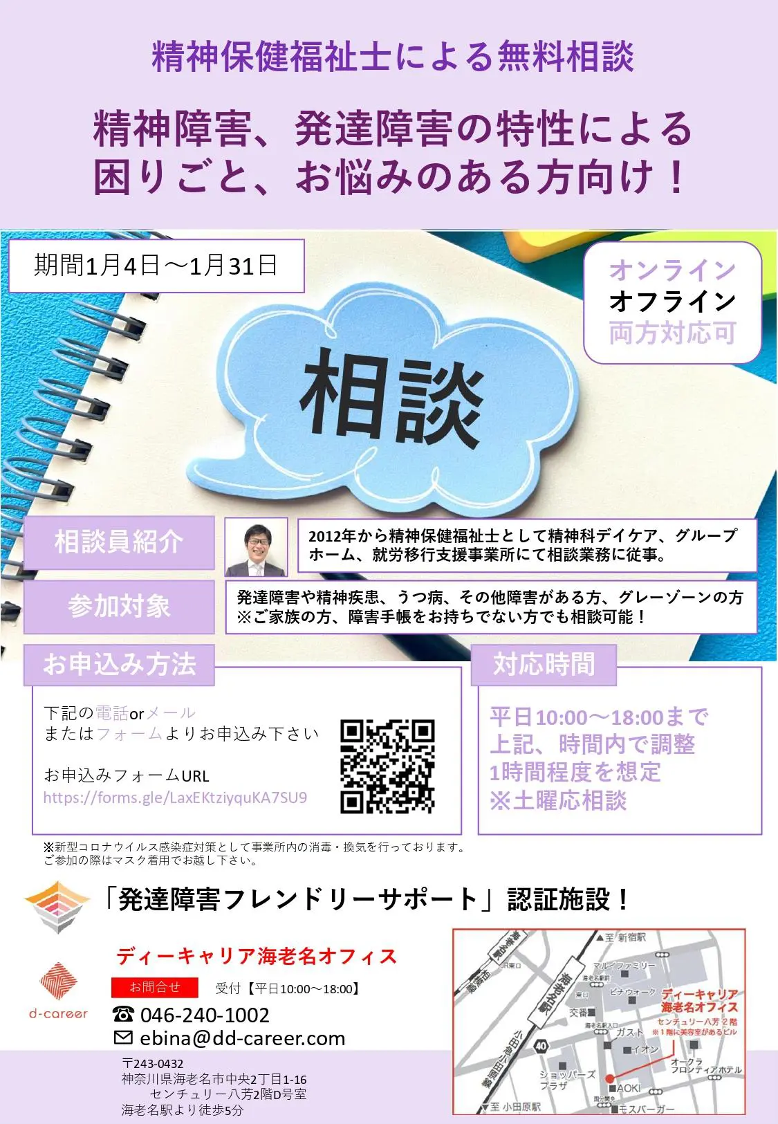 【ディーキャリア海老名オフィス】2023年1月開催「精神保健福祉士による困りごと相談」