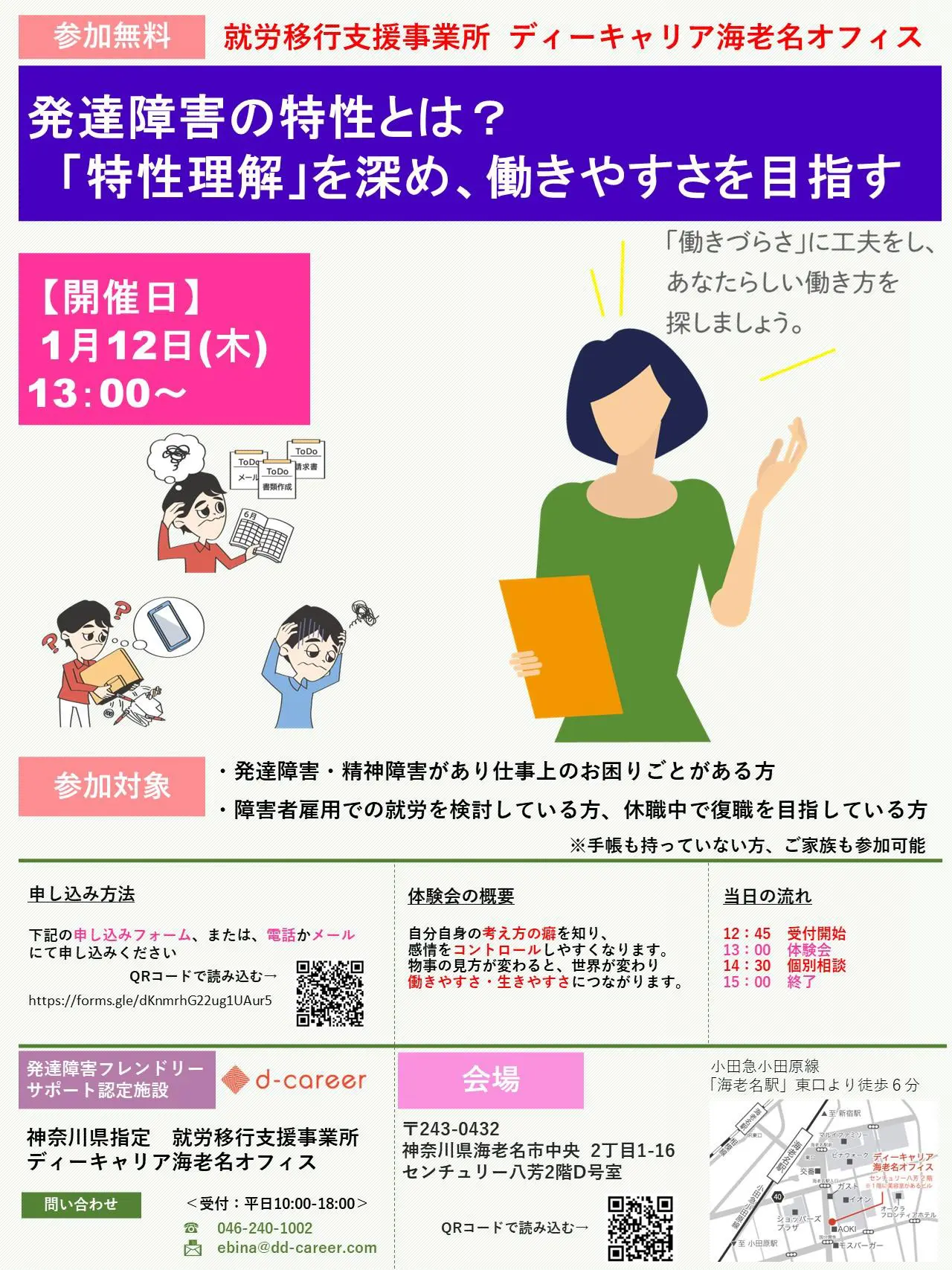 【ディーキャリア海老名オフィス】1月12日(木)開催「発達障害の特性とは?特性理解を深め、働きやすさを目指す!」