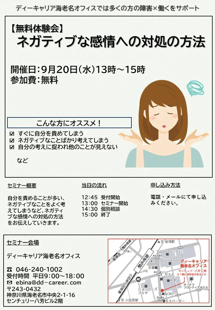 【ディーキャリア海老名オフィス】9月20日(水)開催「ネガティブな感情への対処の方法」