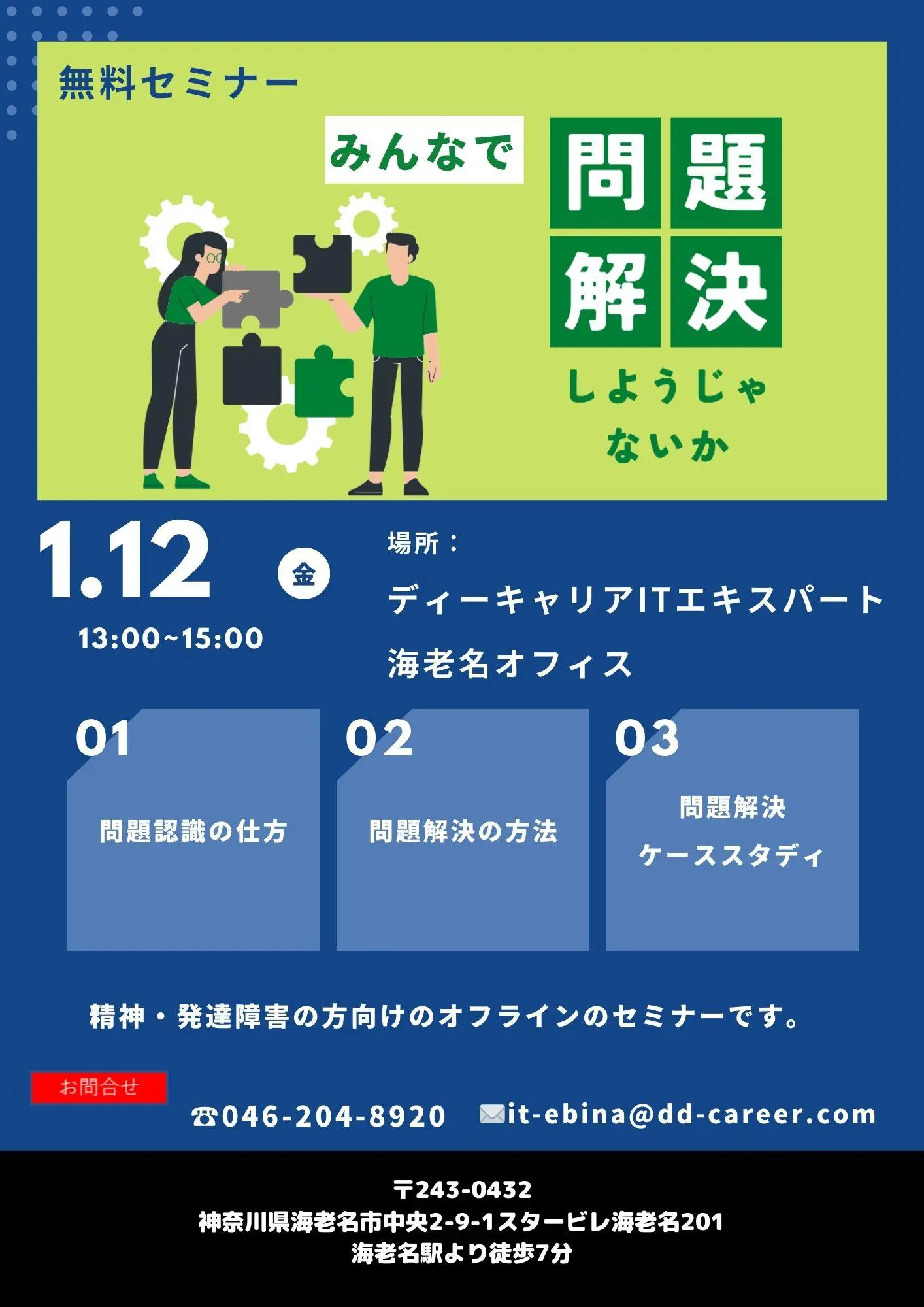 【ディーキャリアITエキスパート海老名オフィス】1月12日(金)「プログラム体験会~問題解決~」