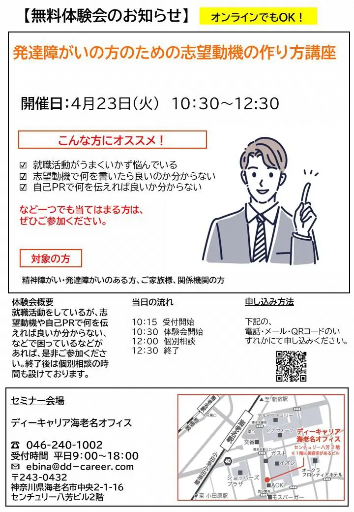 【ディーキャリア海老名オフィス】4月23日(火)開催「発達障がいの方のための志望動機の作り方講座」
