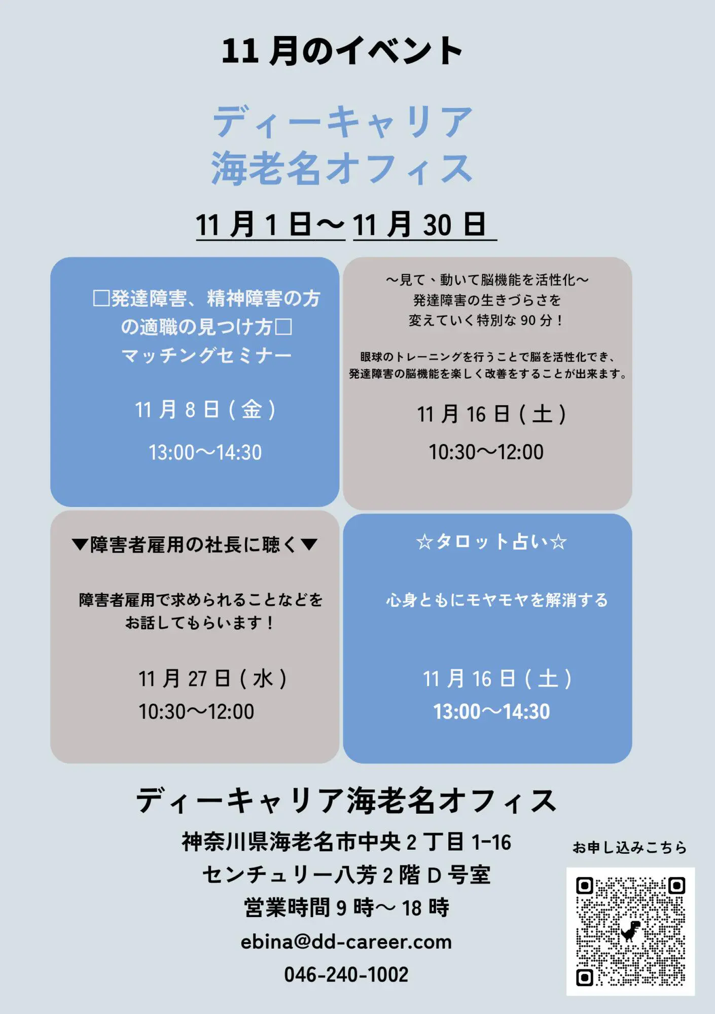 【ディーキャリア海老名オフィス】11月16日(土)開催「~見て、動いて脳機能を活性化~発達障害の生きづらさを変えていく特別な90分!」
