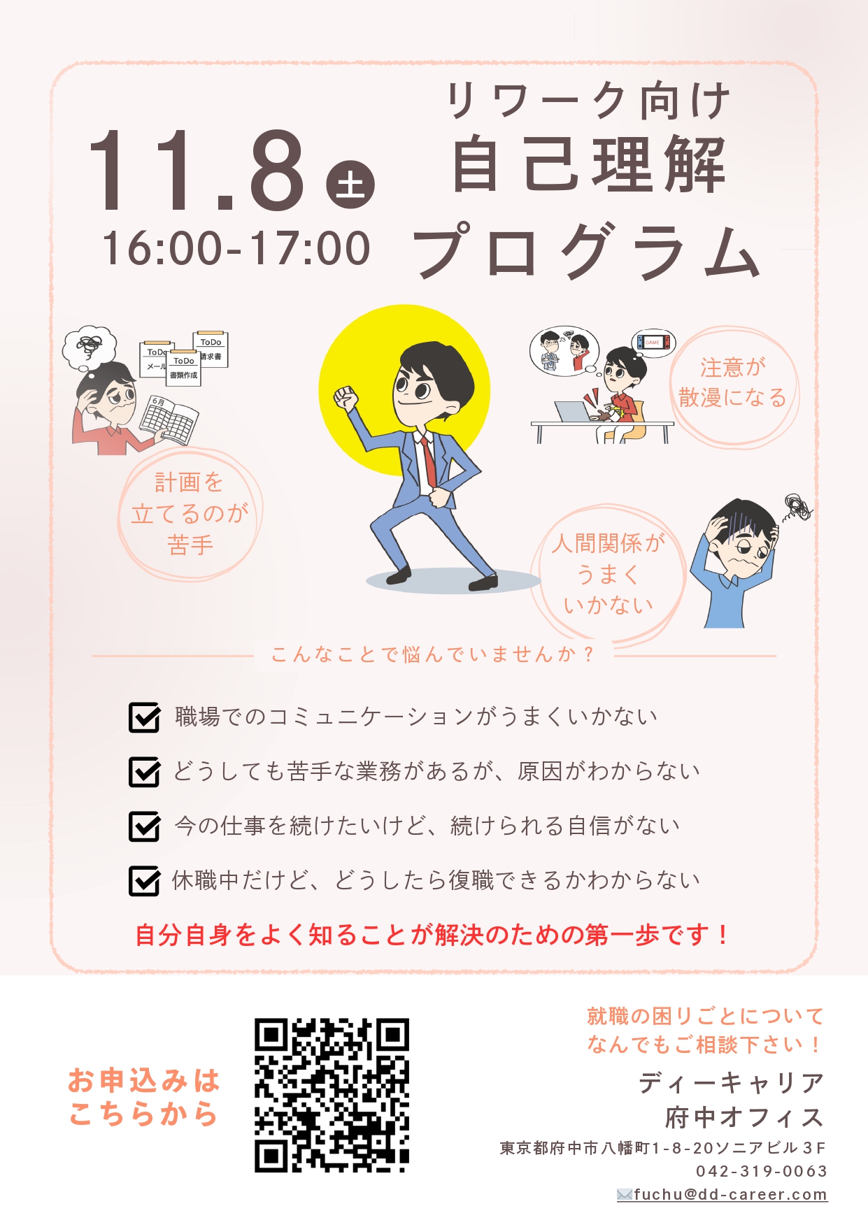 【ディーキャリア府中オフィス】11月08日(土)「リワーク向け自己理解プログラム」