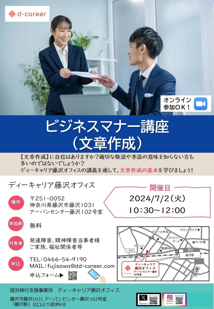 【ディーキャリア藤沢オフィス】7月2日(火)「ビジネス文書の種類やマナーを知り、就労準備を整えよう⭐ビジネスマナー無料プログラム体験会」