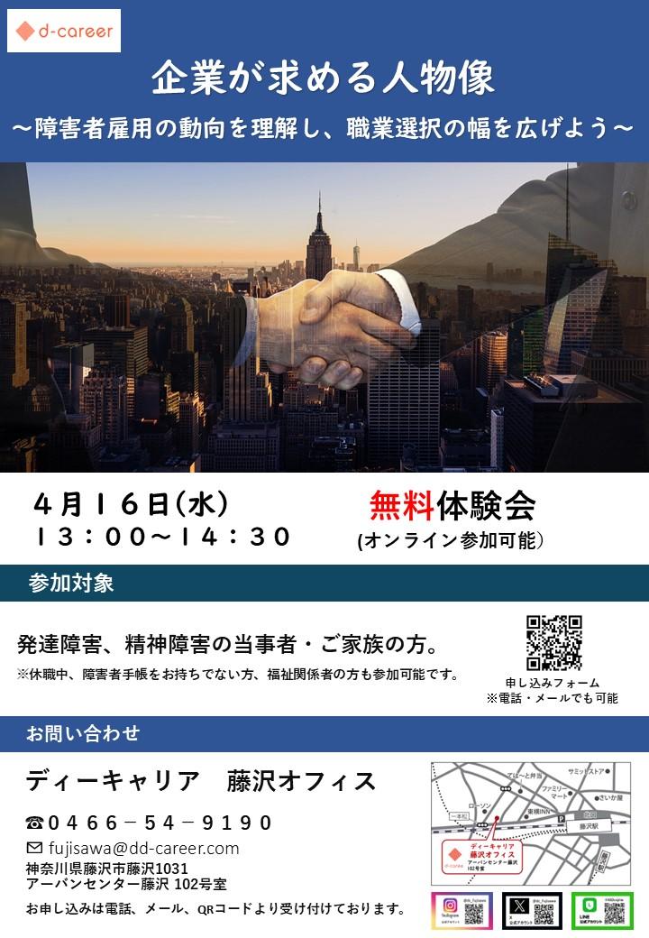 【ディーキャリア藤沢オフィス】4月16日(水)「障害者雇用で求められる要件や人材像を知り、必要な準備を整えよう⭐「企業の求める人材像」無料プログラム体験会」