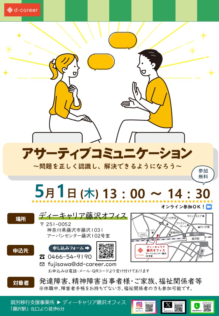 【ディーキャリア藤沢オフィス】5月01日(木)「適切な自己表現の方法を学び、良好な人間関係を築く⭐アサーティブコミュニケーション無料プログラム体験会」