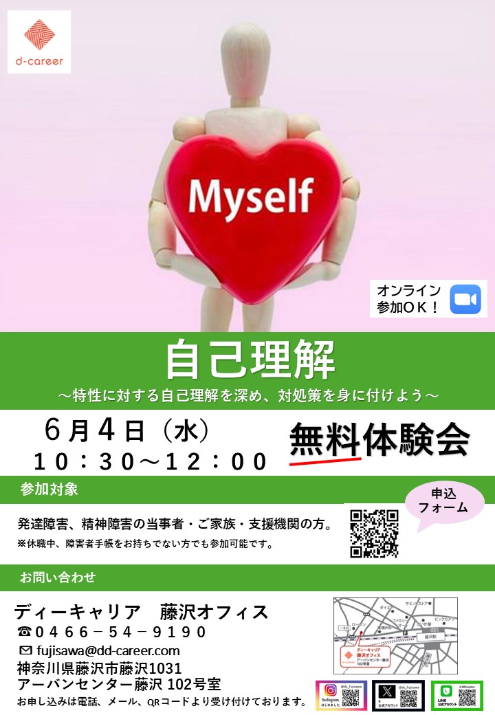【ディーキャリア藤沢オフィス】6月4日(水)「自己理解の重要性と障害特性について理解を深めよう⭐無料プログラム体験会」