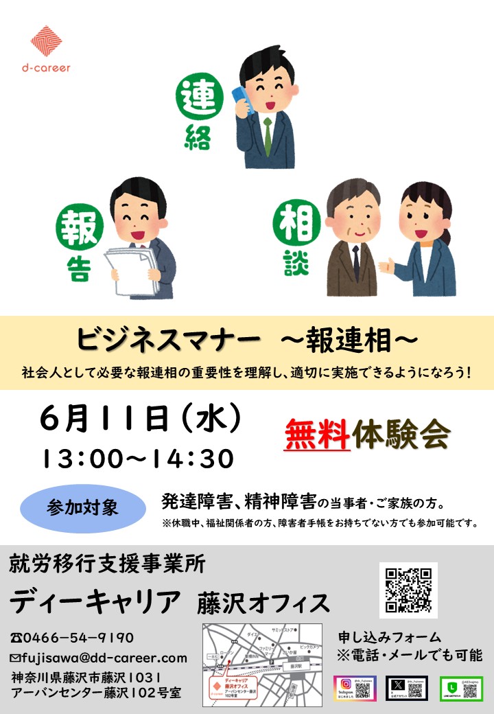 【ディーキャリア藤沢オフィス】6月11日(水)「社会人として必要な報連相の重要性やポイントを知り、適切に実施できるようになる⭐無料プログラム体験会」