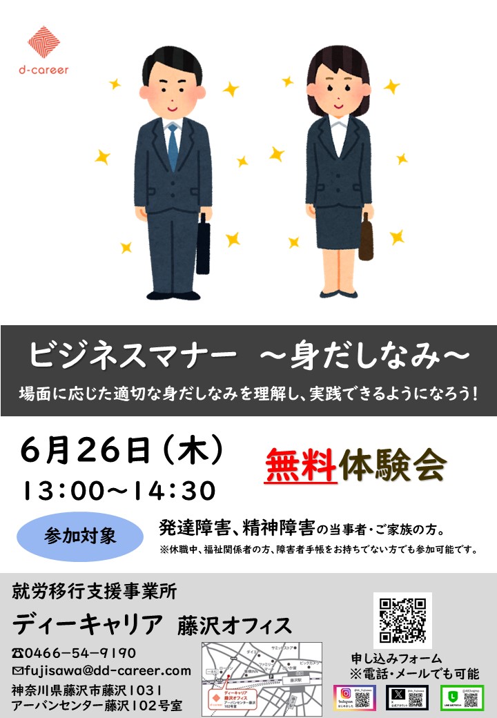 【ディーキャリア藤沢オフィス】6月26日(木)「社会人に求められる身だしなみの基本⭐ビジネスマナー無料プログラム体験会」