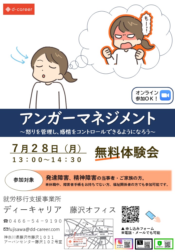 【ディーキャリア藤沢オフィス】7月28日(月)「自身の怒りの傾向を知り、行動・感情をコントロールする⭐アンガーマネジメント無料プログラム体験会」