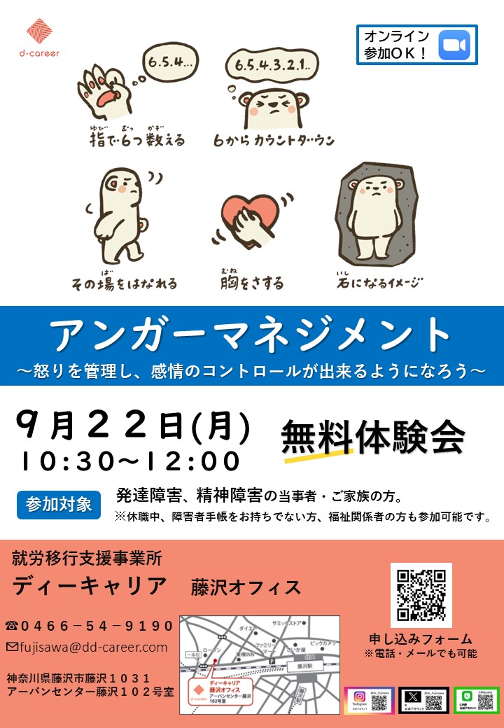 【ディーキャリア藤沢オフィス】9月22日(月)「自身の怒りの傾向を知り、行動・感情をコントロールする⭐アンガーマネジメント無料プログラム体験会」
