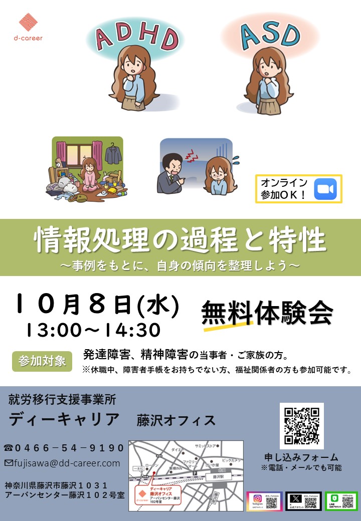 【ディーキャリア藤沢オフィス】10月08日(水)「自己理解の重要性と障害特性について理解を深めよう⭐無料プログラム体験会 」