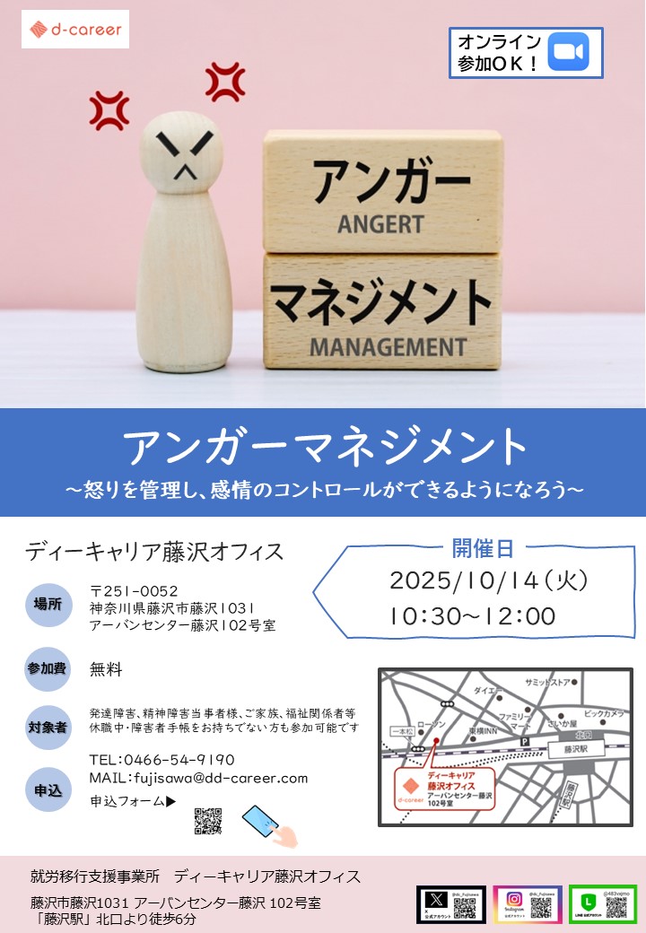 【ディーキャリア藤沢オフィス】10月14日(火)「自身の怒りの傾向を知り、行動・感情をコントロールする⭐アンガーマネジメント無料プログラム体験会」
