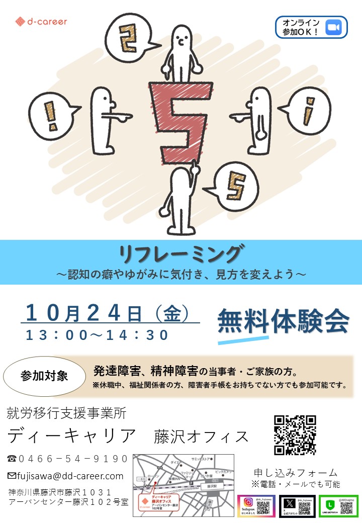 【ディーキャリア藤沢オフィス】10月24日(金)「『考え方の癖』からくる行動・感情のコントロール⭐リフレーミング無料プログラム体験会」