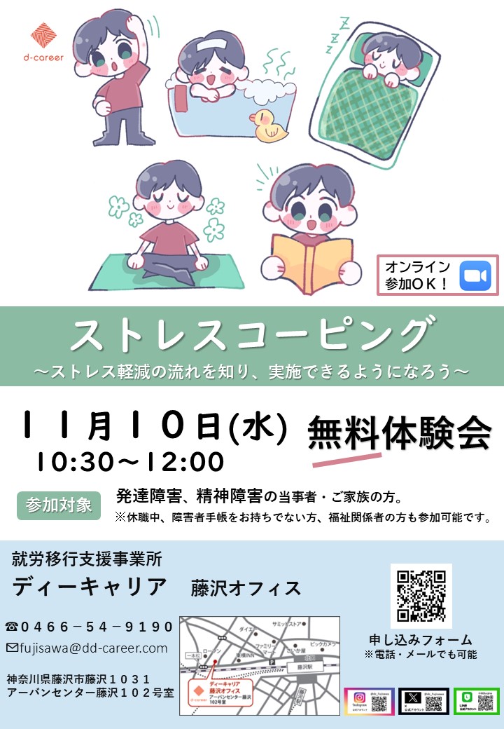 【ディーキャリア藤沢オフィス】11月10日(月)「自身のストレス原因と発散方法を理解し、安定した就労を目指す⭐ストレスコーピング無料プログラム体験会」
