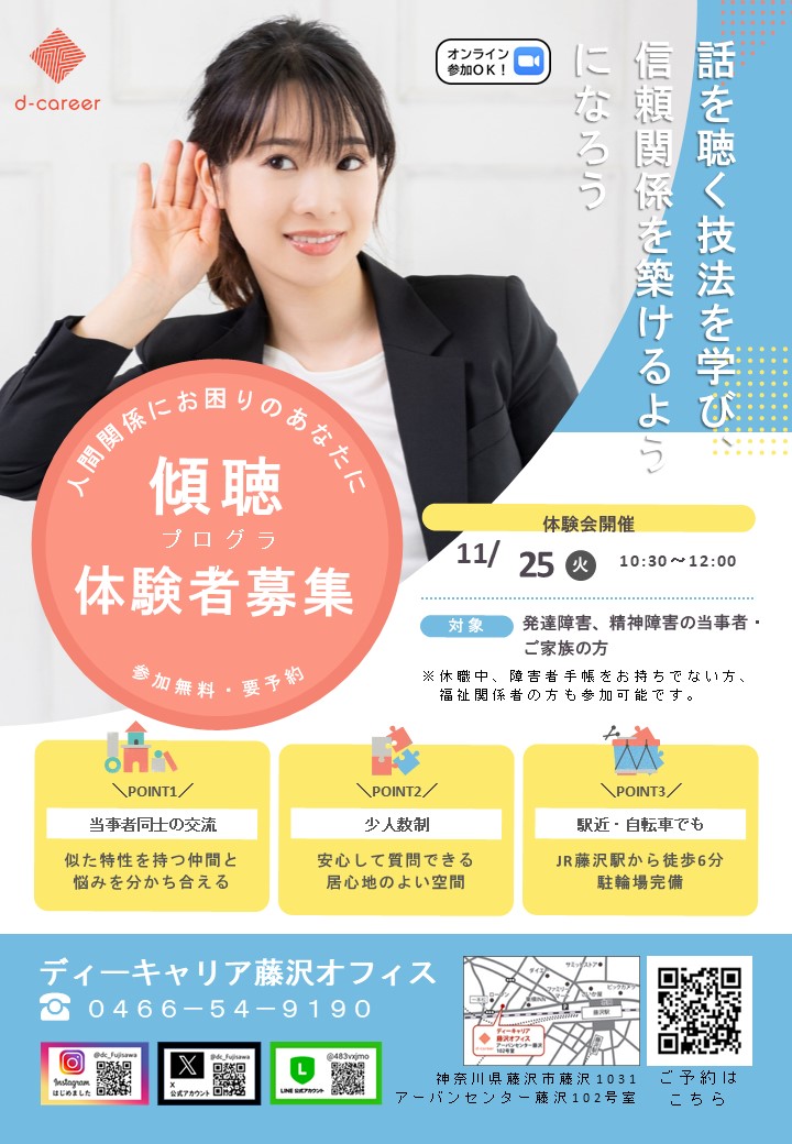 【ディーキャリア藤沢オフィス】11月25日(火)「相手の話に耳を傾け、良好な人間関係を築く⭐「傾聴」無料プログラム体験会」