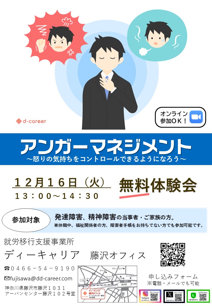 【ディーキャリア藤沢オフィス】12月16日(火)「自身の怒りの傾向を知り、行動・感情をコントロールする⭐アンガーマネジメント無料プログラム体験会」
