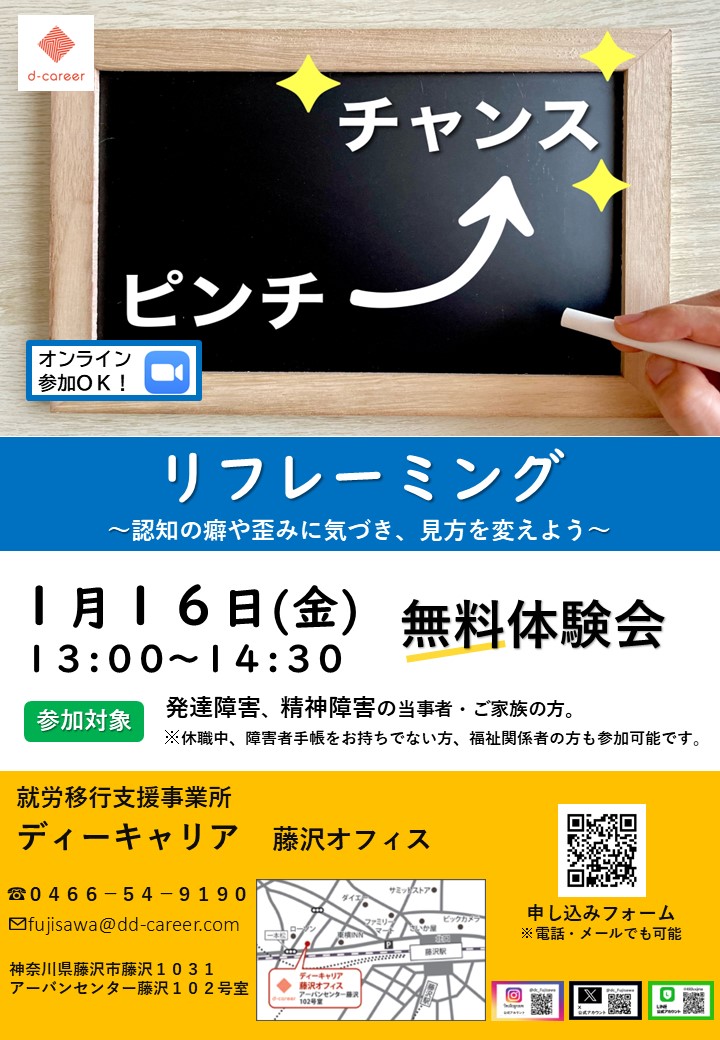 【ディーキャリア藤沢オフィス】01月16日(金)「『考え方の癖』からくる行動・感情のコントロール⭐リフレーミング無料プログラム体験会」