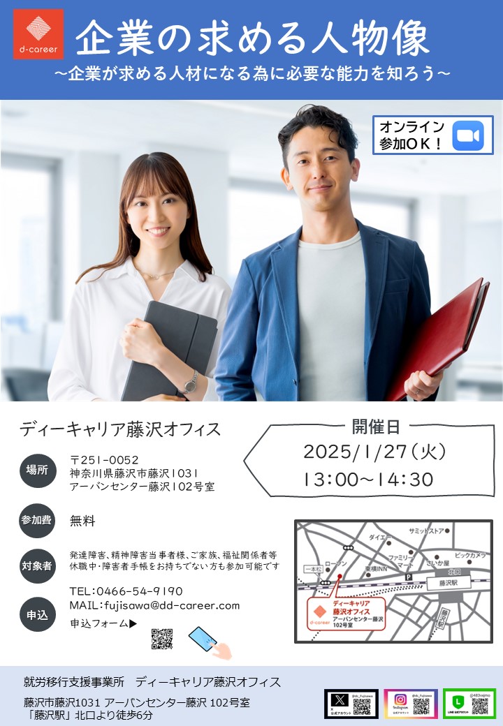 【ディーキャリア藤沢オフィス】01月27日(火)「障害者雇用で求められる要件や人材像を知り、必要な準備を整えよう⭐「企業の求める人材像」無料プログラム体験会」