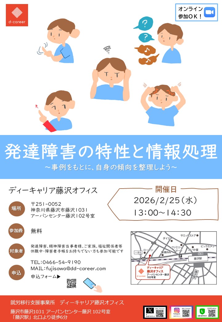 【ディーキャリア藤沢オフィス】02月25日(水)「自己理解の重要性と障害特性について理解を深めよう⭐無料プログラム体験会」