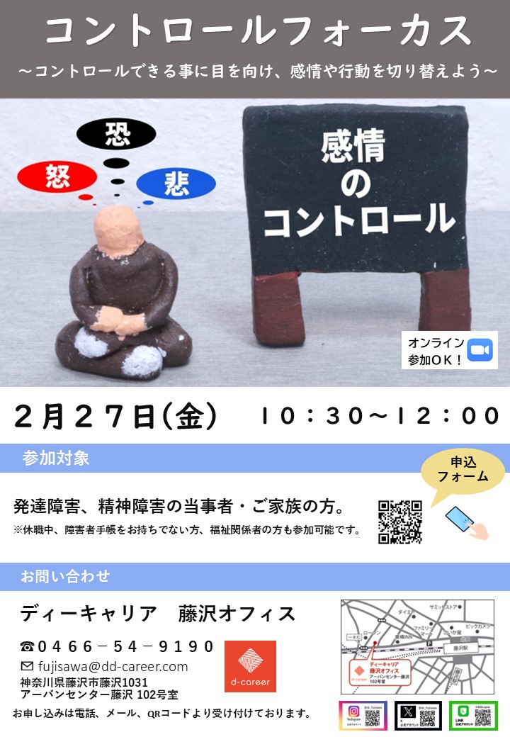 【ディーキャリア藤沢オフィス】02月27日(金)「コントロール出来ることに目を向け感情と行動を切り替えよう⭐コントロールフォーカス無料プログラム体験会」